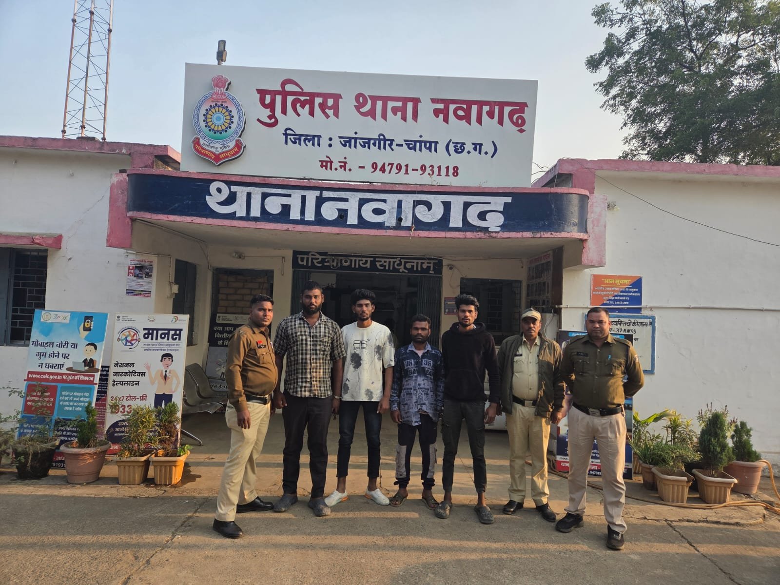 सभी निवासी ग्राम कटौद थाना नवागढ़ जिला जॉजगीर चाम्पा के है उपरोक्त कार्यवाही में निरीक्षक कमलेश सेंडे थाना प्रभारी नवागढ़ एवं थाना स्टाफ का सराहनीय योगदान रहा।