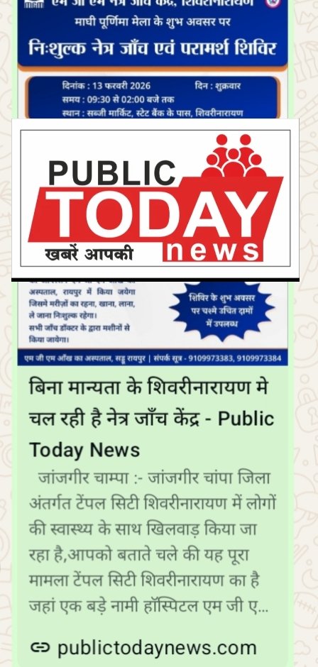 जांजगीर चाम्पा :- कल पब्लिक टुडे न्यूज़ ने “बिना मान्यता के शिवरीनारायण मे चल रही है नेत्र जाँच केंद्र ” शीर्षक के माध्यम से खबर प्रकाशित थी जिस पर खंड चिकित्सा अधिकारी डाक्टर यशपाल खन्ना के द्वारा जानकारी दी गई कि आज जो नेत्र शिविर का आयोजन होना था उसे स्थगित करने का निर्देश दिया गया है इसके उपरांत भी वह शिविर का आयोजन करते हैं तो उन पर विधिवत कार्रवाई की जावेगी