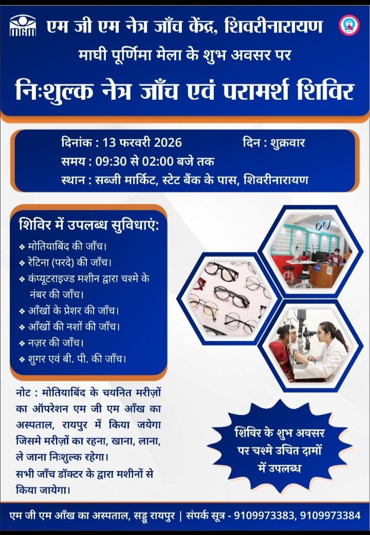 जांजगीर चाम्पा :- जांजगीर चांपा जिला अंतर्गत टेंपल सिटी शिवरीनारायण में लोगों की स्वास्थ्य के साथ खिलवाड़ किया जा रहा है,आपको बताते चले की यह पूरा मामला टेंपल सिटी शिवरीनारायण का है जहां एक बड़े नामी हॉस्पिटल एम जी एम नेत्र रायपुर की ब्रांच के रूप में शिवनंदन में नेत्र जांच केंद्र खोला गया है जिसके द्वारा नहीं विभाग से कोई परमिशन ली गई है और नही शासन के कोई गाइडलाइन का पालन किया जा रहा है साथ ही यह आँख जाँच केंद्र एक कमरे संचालित हो रहा, ज्ञात हो की यह जाँच केंद्र आगामी 13 फरवरी को निशुल्क नेत्र जांच एवं परामर्श शिविर का भी आयोजन कर रही है,देखने वाली बात होंगी की मामला सामने आने पर जिला प्रशासन द्वारा इस पर क्या कार्रवाई की जाती है