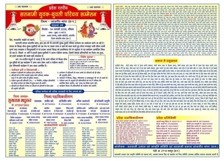 जांजगीर चाम्पा :- प्रदेश स्तरीय सतनामी समाज युवक-युवती परिचय सम्मेलन का आयोजन 4 जनवरी 2026 को शारदा मंगलम जांजगीर सम्पन्न होगा